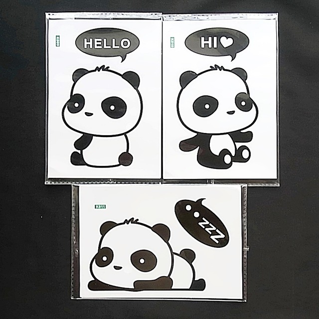 かわいいちょっとぽってりとしたパンダのウォールステッカー3枚セットです。 リビングや子供部屋のスイッチパネルなどに貼るだけで癒されます。 ツルツルした平面に転写シートに写し取り貼るタイプです。 部屋、窓、浴室、トイレ、冷蔵庫、キッチン、天井等、平らな場所に貼ってお手軽イメージチェンジ! ガラスにも貼れます。 凸凹やザラザラした所、ペンキ塗装の面には貼らないようご注意下さい。 スイッチパネルやコンセントに貼ればお子様も大喜び! サイズは、約縦15.5cm x 横11cm。 材質はPVC。 【貼り方】 1.ステッカーを貼る場所をきれいに拭く 2.ステッカーを台紙から剥がす 3.壁や家具など貼りたい場所に貼る ※シワや気泡が入らないよう、タオルなどでこすりながら貼ってください。 ※大きいサイズのステッカーは、台紙から少しずつ剥がしながら貼ると、より綺麗に貼ることができます。 ※何度も剥がせて、好きな位置に貼り付け可能です。