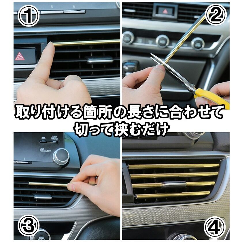 お好みの長さにモールを切って、車のエアコンの吹き出し口に挟むだけで、装着完了!